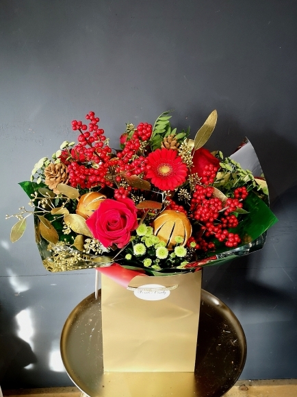 • Christmas nfresh flowers bouquet to include Ilex and red roses arranged by local florist in Bromley