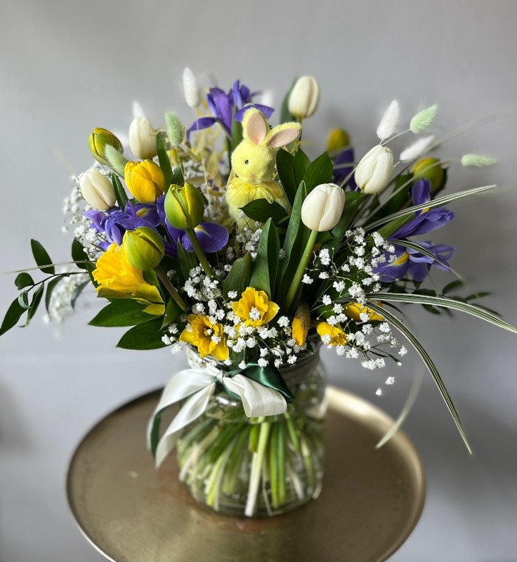 Yellow double tulips and iris and pussy willow vase. With hanging bunny decoration.