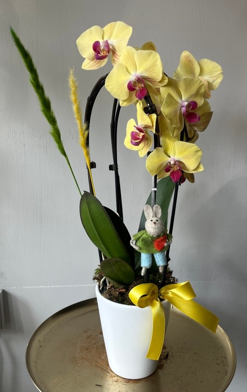 Decorated yellow orchid plant with mr bunny felt figurine and pampas grass.