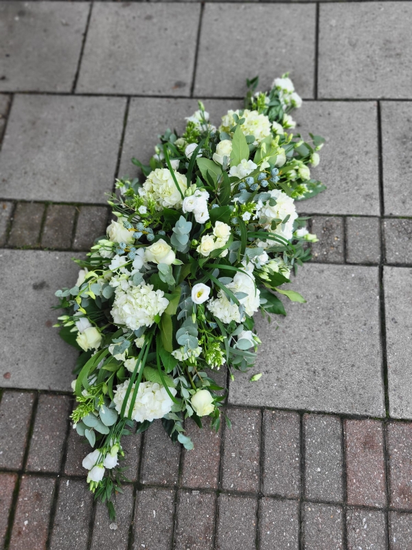 • Mixed white flowers coffin toninclude white hydrangeas made by florist from Bromley.