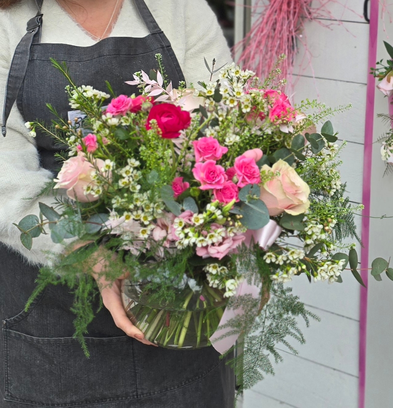 Mixed pinks flowers bouquet arranged in 10inch glass fish bowl. Stunning and elegant gift for a mum.