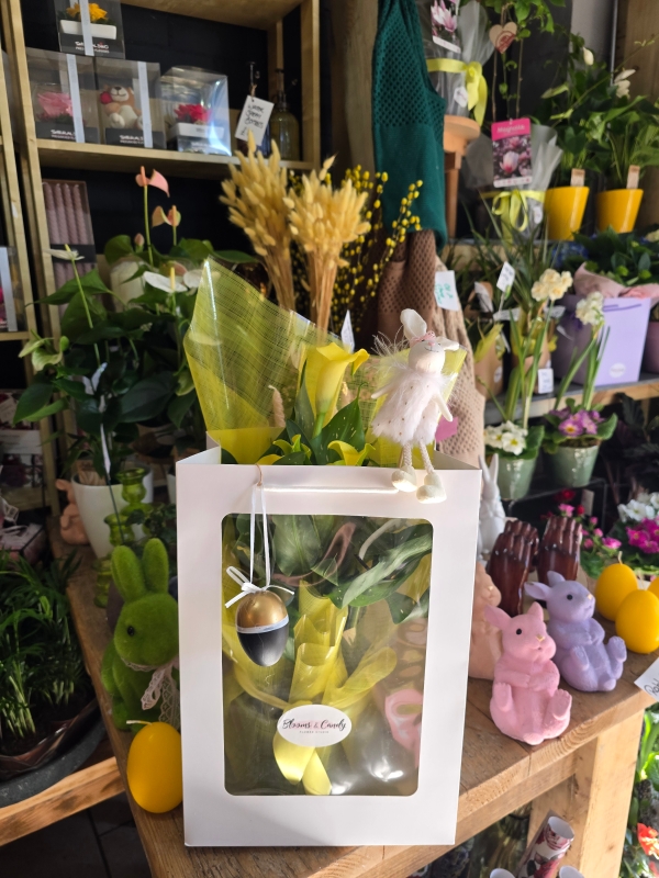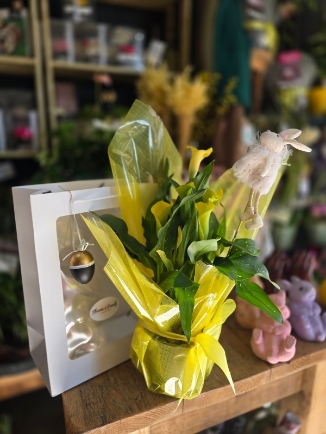 Yellow Calla 45cm tall outdoor plant gift wrapped in white bag with rabbit pic and hanging egg.